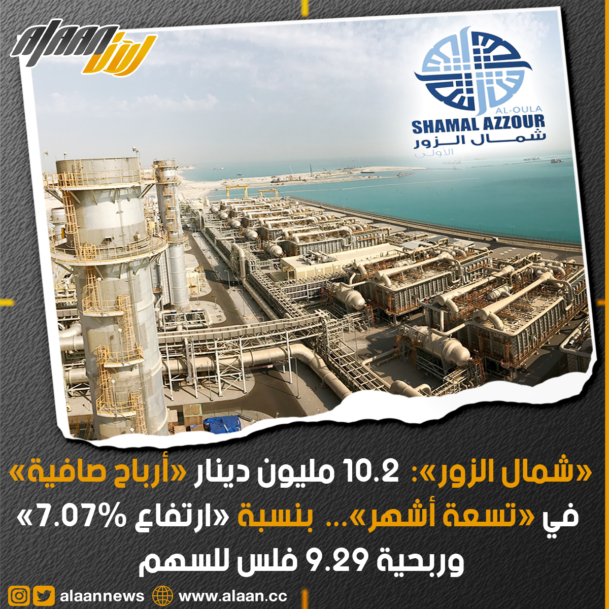 أعلنت شركة شمال الزور الأولى للطاقة والمياه الكويتية اليوم الخميس، تحقيقها 10.2 مليون دينار كويتي (نحو 31.6 مليون دولار أميركي) أرباحاً صافية في الأشهر التسعة الأولى من السنة الحالية بنسبة ارتفاع 7.07 في المئة.