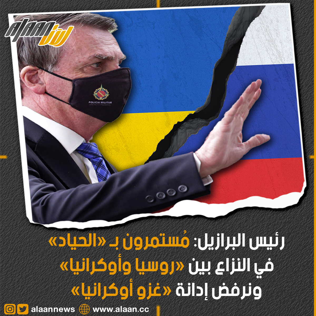 (أ ف ب) - أعلن الرئيس البرازيلي جايير بولسونارو بعد حديثه مع نظيره الروسي فلاديمير بوتين، أن بلاده ستواصل الحفاظ على "الحياد" ولن "تنحاز" إلى أي طرف في ما يتعلق بالغزو الروسي لأوكرانيا.