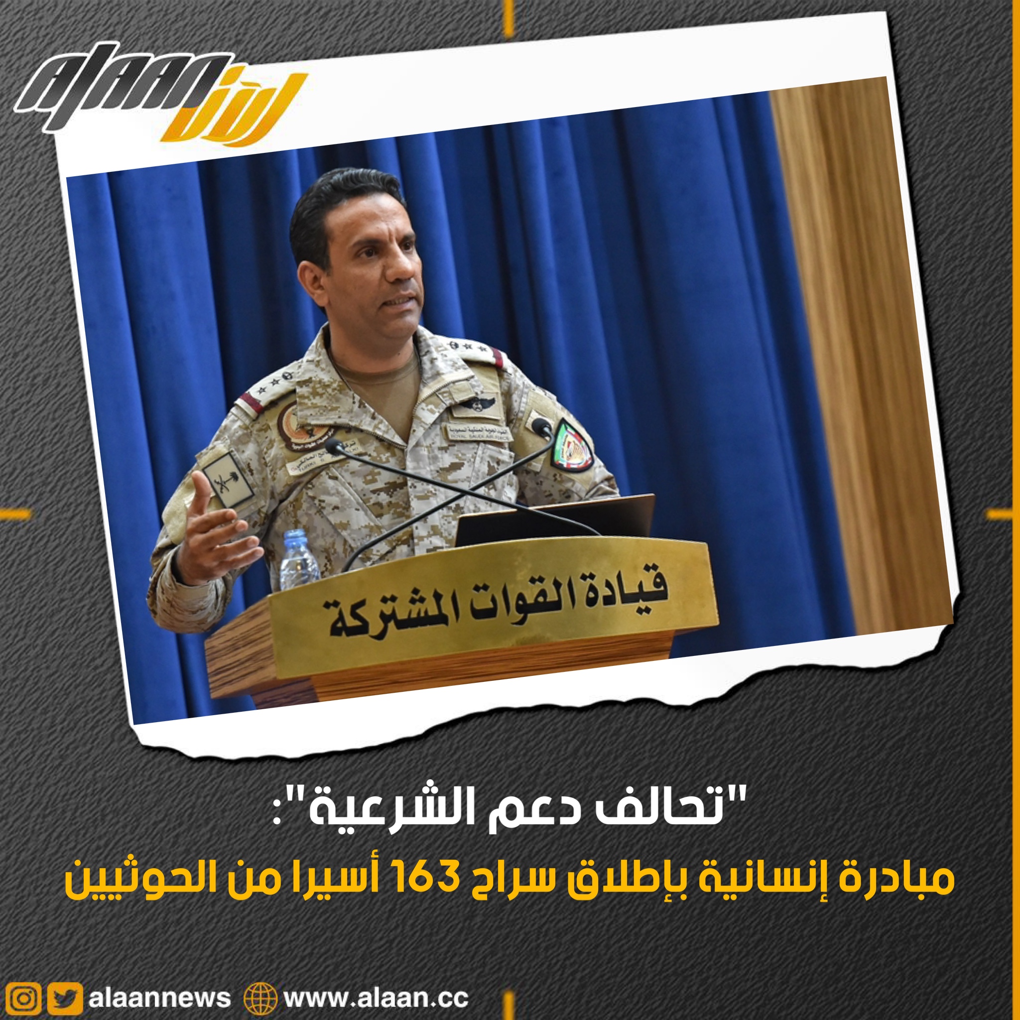 وبين العميد المالكي أن قيادة القوات المشتركة للتحالف بدأت إنهاء إجراءات إطلاق سراح الأسرى ال163 بالتنسيق مع اللجنة الدولية للصليب الأحمر ليتم نقلهم إلى العاصمة اليمنية (صنعاء).