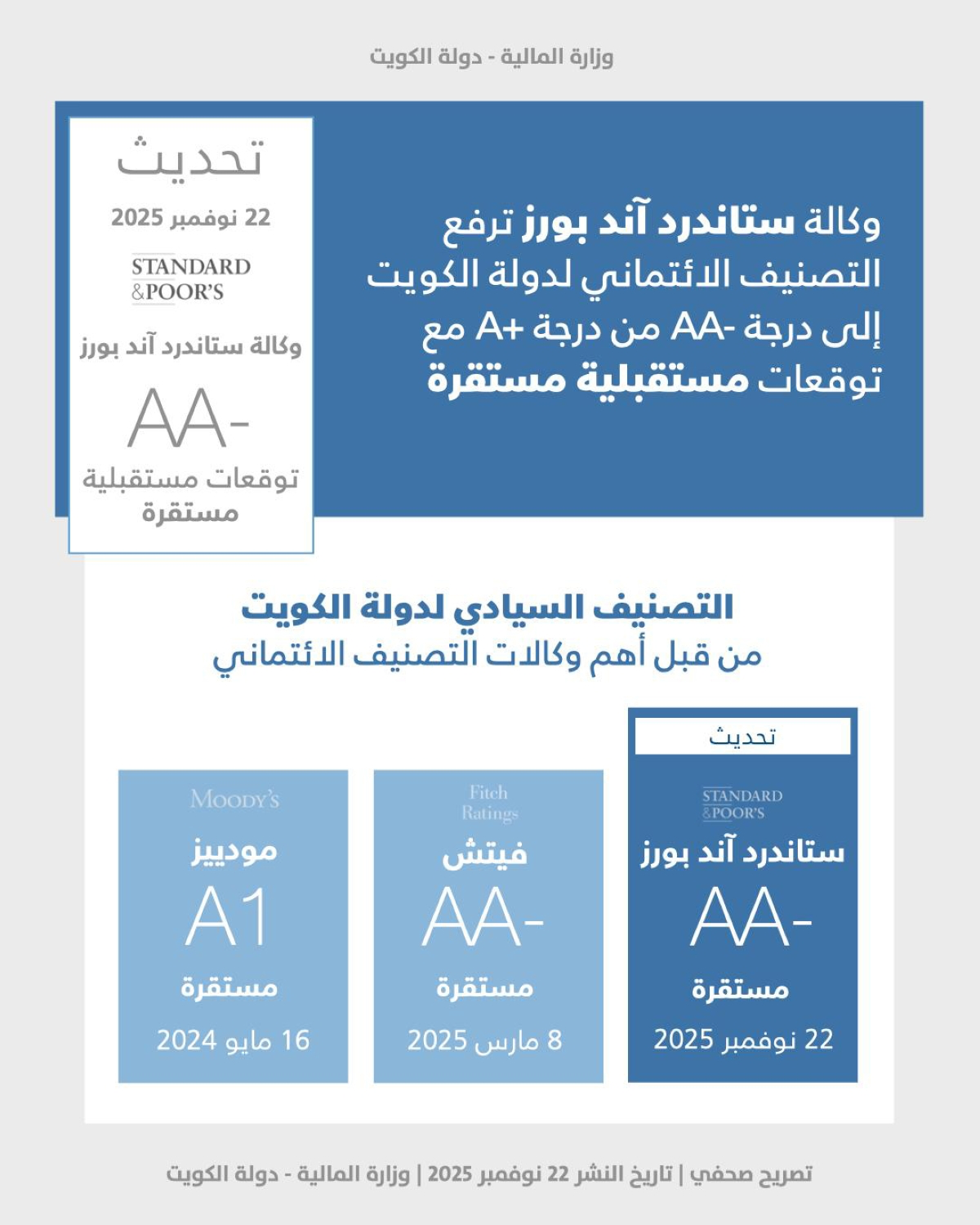 وبهذه المناسبة صرّح وزير الكهرباء والماء والطاقة المتجددة وزير المالية وزير الدولة للشؤون الاقتصادية والاستثمار بالوكالة د. صبيح المخيزيم بأن «ترقية التصنيف الائتماني السيادي تعكس الزخم الإيجابي للإصلاحات الهيكلية والمالية التي تنفذها الكويت، وتؤكد التزام الدولة بمواصلة تطوير الاقتصاد وتنويع مصادر الدخل، كما أن هذا التقييم يعزز قدرة الكويت على تحقيق التنمية المستدامة والمرونة المالية على المدى الطويل».