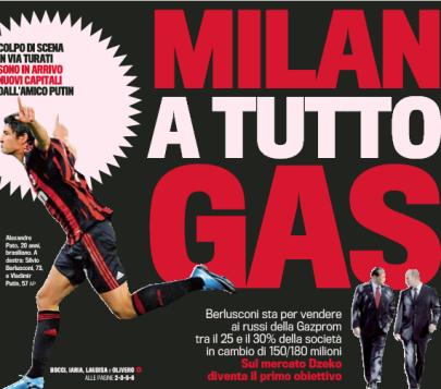 صحيفة اللاغازيتا ديلو سبورت الإيطالية أكدت أن الميلان اقترب من البيع من خلال سيلفيو بيرلسكوني الى شركة غاز بروم الروسية ، بيرلسكوني سوف يستفيد من صداقته مع بوتين ، وسيعقد صفقة مع أحدى الشركات الروسية التي سوف تشتري من 25 إلى 30% من أسهم النادي ، وسيكون المقابل بين 150 و 180 مليون يورو ، لتدخل تلك الأموال خزينة الميلان وسيستفاد منها الميلان في القيام بتعاقدات جديدة.