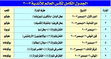 وضعت اللجنة المنظمة لبطولة كأس العالم للأندية لكرة القدم الجدول الكامل لمباريات البطولة قبل إعلان الاسماء النهائية للفرق المشاركة في البطولة حيث تقام البطولة خلال الفترة من 7 إلي 16 ديسمبر القادم في 3 مدن يابانية هي طوكيو ويوكوهاما وتويوتا في المرة الأخيرة التي تقام فيها البطولة باليابان قبل ان يفتح الاتحاد الدولي 'الفيفا' المجال لأي دولة أخري لتنظيم البطولة بداية من عام .2008