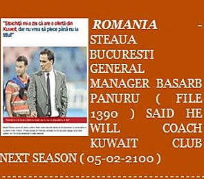 كشف موقع ورلد كوتش العالمي للمدربين ان المدرب الروماني باسراب باندرو أكد خلال حديثه مع وسائل الإعلام الرومانية انه حصل على عرض لتدريب احد الفرق الكويتية وقال انه لا يريد أن يترك فريقه ستيوا بوخارست حتى يفوز باللقب واضاف ان العرض الكويتي سيتم مناقشته في شهر مايو القادم بعد الانتهاء من العام الرياضي للموسم الحالي واشار ان العرض المالي الكويتي جيد ولم اترك فريقي هذا العام وسيتم مناقشة العرض الكويتي بعد نهاية الموسم الرياضي الحالي , ونشر الموقع صورة الخبر .