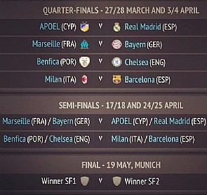 وجنبت القرعة الريال والبرسا اللعب في الدور النصف النهائي بحيث يلتقي الفائز من الريال وأبويل مع الفائز من البايرن ومارسيليا، علي أن يلتقي الفائز من برشلونة والميلان مع الفائز من بنفيكا وتشيلسي.