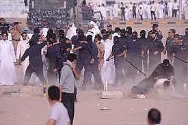 فكر العقيد الذي كان يخاطبني قليلاً, ثم قال: 'إذا لم يكن هناك قانون يمنع من التصوير فسأذهب بك للمخفر على تهمة مخالفة أوامر رجال الأمن' , رديت عليه و قلت له بأنني لا أريد مخالفة أي أوامر لكنني أريد معرفة لماذا يتم اقتيادي للمخفر؟ في هذه اللحظة أتى السيد 'مبارك الدبداب' وهو ناشط سياسي ممن لا يتخلفون أبداً عن أي مظاهرة أو إعتصام وطني, و بدأنا نحن الأثنين نحاول إقناع العقيد بأنني لم أرتكب أي جرم. صرخ العقيد في وجوهنا و اتهمنا بأننا نخون أبناء الوطن من الجنود و نضع صور لهم على 'تويتر' لنظهرهم بصورة لا أخلافية و نُشهِر بهم و نقنع الناس بأنهم مخطئون في حق البدون. قلت له: 'إن كنتم ترون أن ما تفعلونه هو الصواب فلماذا الخوف؟' رد علي غاضباً بأنه مأمور بالقيام بهذا العمل و أنه مجبور. فرديت عليه و قلت أنه في هذه الحالة اللوم ليس عليه شخصياً و إنما اللوم على من يوجه له الأوامر. لم يقلل هذا من غضبه و أخذ يصرخ: 'أنتِ لا تعرفين ماذا يحصل عندما يقوم أمثاكِ بنشر هذه الصور على 'تويتر' المواطنون يكرهوننا و يمقتونا, و يتعرضون للجنود بالإهانة و السباب, أنتِ مواطنة و المفروض أن لا تسمحي لذلك أن يحصل' . ألزمني بمسح الصورة و إلا سيقودني إلى المخفر! أردت أن أرد و أقول له بأنه هو و أعوانه يقومون بالتعرض للبدون و بإهانتهم و ضربهم و سبهم و إنتهاك حرمات بيوتهم منذ أعوام طويلة, فكيف لا يرضى لأحد أن يحتج على أسلوبه وأسلوب جنوده الوحشي في قمع البدون؟ و لكنني لم أفعل لأنني رأيت بأن ردي هذا لن يزيد الوضع إلا سوءاً و لن يؤدي إلا إلى زيادة حساسية الموقف , فسَكَت ومسحت الصورة الوحيدة التي أخذتها والتي لم تكن واضحة أصلا لبعض المدرعات. سجل أحد أعوانه بياناتي و بيانات السيد مبارك الدبداب. وقال لي بأنه يجب علي أن أبتعد عن هذا المكان, فرديت عليه و أصريت بأنني لن أذهب و أنني سأشارك أخواني البدون مظاهرتهم. عندما رأى القوات الخاصة أنني مُصِرة طلبوا مني أن أقف بعيداً و أشاروا إلي أن أعود إلى الوراء فامتثلت لأوامرهم وذهبت ووقفت بعيدا في المكان الذي حددوه لي. ثم أتوا ثانية و طلبوا مني أن أعود للوراء أكثر, فامتثلت لطلباتهم, ثم عادوا مرة ثالثة و طلبوا مني العودة للوراء أكثر, ففعلت. بدأ بعض الشباب البدون بالقدوم ولم يكونوا يحملون أي شيء على الإطلاق, لم يكن معهم لوحات أو 'بوستر' أو أعلام أو أي شيء. فوقفوا في المكان المخصص لهم و لم يتعدوه و بدأوا يغنون النشيد الوطني. بعدها صاحوا 'جرية, حرية, سلمية, سلمية, سلمية..' و قمت بترديدها معهم , وبعد ذلك غنوا وغنيت معهم 'نبيها منك يا الأمير لا عضو و لا وزير' و رددناها معاً أكثر من مرة.. و كنا نقف صفاً واحدا, ولم نتحرك من المكان الذي خصصه لنا القوات الخاصة, و كنت أراقب الجنود, لأنهم كانوا في كل لحظة يقتربون منا أكثر فأكثر و بعدها بقليل بدأ يلبس الجنود أقنعة على وجوههم ليغطوا ملامحهم و فجأة من دون سابق إنذار ركض الجنود نحونا و أخذوا يمسكون بأي شاب يستطيعون الإمساك به و ينهالون عليه بالضرب المبرح. صُعِقت عندما رأيت هذا المنظر و تجمدت و لم أستطع الحركة لبضعة ثوانِ ثم ركضت لشاب كان يتم ضربه على التراب و تكبيل يده من قبل أربع جنود فأخذت أصيح: 'لا تضربه لم يفعل شيئا, لماذا تضربونه لم يفعل شيئا..' صرخ الجنود في وجهي 'ابتعدي.. إبتعدي من هنا' و جروا الشاب من شعر رأسه وأخذوه, ثم ركضت لآخر كان مصيره الشيء نفسه و كان الجنود يدسون رأسه بقوة في التراب و يضربونه و يكبلون يديه في نفس الوقت, فلما رفعوا وجهة من التراب كانت الدماء تسيل من فمه, فرفعوه من الأرض من شعر رأسه و أخذوه , وكنتُ أصيح و أقول 'هذا ظلم, ما تفعلونه حرام...' وأكررها و أصرخ... والجنود يصرخون علي 'إبتعدي من هنا, إبتعدي واتركينا ننهي عمالنا' ... أخذت أتلفت فوجدت شاب في كل زاوية يتعرض لنفس الدرجة من الظلم و البطش, وأحد الأطفال رمى بنفسه فوق أخوه الأكبر الذي كان يتلقى ضربات قاسية من مطاعات الجنود ليحميه من ضرباتهم فتلقى هو من الألم و العنف ما لا يتحمله طفل صغير بسنه... كان جسدي بأك