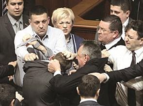 شهد البرلمان الاوكراني امس معركة دارت رحاها بين عدد من النواب وذلك اثناء مناقشة انتخابات العمدة في كييف، ورغم انه لم تورد التقارير اي اصابات بليغة، لكن عددا من النواب وخلال النقاش دخلوا في سجال حاد سرعان ما تحول الى ضرب وركل وشد شعر.. وعض .