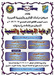 ضمن الموسم الثقافي لمركز دراسات الخليج والجزيرة العربية في جامعة الكويت للعام الجامعي 2012 / 2013 يقيم المركز ندوة بعنوان : ' الرعاية الاجتماعية والتنمية '، ويحاضر فيها كل من: الخبير بالمعهد العربي للتخطيط د.فهد يوسف الفضالة، عضو هيئة التدريس بقسم الاجتماع والخدمة الاجتماعية في كلية العلوم الاجتماعية د. هند المعصب، وعضو هيئة التدريس بقسم الاجتماع والخدمة الاجتماعية في كلية العلوم الاجتماعية أ. محمد الضويحي، ويترأس الندوة مساعد عميد شئون الطلبة للخدمات الطلابية د. هيفاء الكندري، وذلك في تمام الساعة 2:30 من ظهر يوم الثلاثاء الموافق 2/7/2013 في القاعة الدولية – كلية العلوم الاجتماعية – الحرم الجامعي الشويخ.