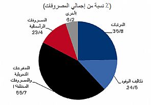 كما إن الإنفاق الجاري يشمل الرواتب والأجور للمدنيين والتي يقدر ارتفاعها بواقع 1٪ مقارنة مع مستواها للسنة السابقة. وقد تأثر هذا الارتفاع بتراجع الاعتماد التكميلي الذي يتم استخدامه أحياناً للمصروفات الطارئة أو من أجل تمويل الالتزامات المستجدة التي لم تكن مأخوذة في الاعتبار عند اعداد الميزانية. لذلك فإن البيانات قد لا تكون دليلاً قاطعاً لتوجه عام حول مصروفات هذا الباب في الميزانية. وتمثّل الرواتب والأجور للمدنيين ما نسبته 28٪ من إجمالي المصروفات الجارية، اما كافة مصروفات التوظيف فتمثل 50٪ منها.
