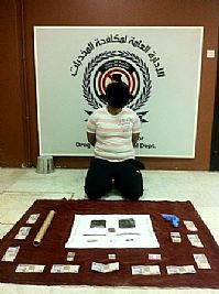 وذلك بعد ورود معلومات من أحد المصادر تفيد بأن متهماً خليجياً يحوز ويحرز مواد مخدرة ومؤثرات عقلية بقصد الاتجار وبعد التأكد من صحة وجدية المعلومات تم استصدار الإذن القانوني اللازم وقامت فرقة من إدارة المكافحة المحلية بضبطه متلبساً في مسكنه حيث كان بحوزته علبة سجائر بداخلها كيس من الحبوب المخدرة وقطعة حشيش وكيس به مادة الآيس، وبتفتيش مسكنه تم العثور على ما يقارب (700) جرام من مادة الحشيش المخدرة، وعدد (20) حبة من المؤثرات العقلية، وجرام واحد من مادة الآيس المخدرة، وقد تم إحالة المتهم والمضبوطات إلى جهة الاختصاص.