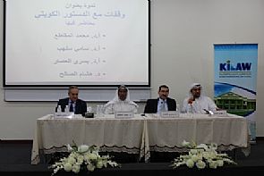 أما الحلقة النقاشية الثانية التي حملت عنوان ' وقفات مع الدستور الكويتي' وشارك فيها رئيس وعميد الكلية أ.د. محمد المقاطع، وأ.د. يسري العصار العميد المساعد للشؤون العلمية ورئيس قسم القانون العام، وأ.د. سامي سلهب أستاذ القانون المساعد، د. هشام الصالح الأستاذ المساعد للقانون العام، استهلها أ.د. المقاطع بالقول إننا نعرف بعد 51 عاما على صدور الدستور الكويتي مدى متانة ورسوخ هذا الدستور الذي نقل الكويت من مجتمع البداوة والقبلية إلى الدولة الحديثة، لأنه يتحلى بالعديد من الجوانب المميزة التي يندر أن توجد في دستور آخر، ومن أبرزها التأثر المباشر بالفكر الإسلامي حيث لا توجد أي مادة فيه تتعارض مع أحكام الشريعة الإسلامية، كما أنه جمع بين متناقضات وحاول أن يؤالف بينها بمزيج يتناسب مع البيئة الكويتية، وجمع بين النظامين الرئاسي والبرلماني، وبين الأنظمة الاقتصادية الإسلامية والرأسمالية والاشتراكي وبيّن خصوصية الهوية الكويتية، كما يتميز الدستور الكويتي بأنه أخضع نفسه للتعديل.