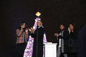 تحدى الرئيس الأميركي 'باراك اوباما' وأسرته المطر والبرد وعبروا الشارع من البيت الابيض ليترأسوا إضاءة شجرة عيد الميلاد الوطنية الاميركية.