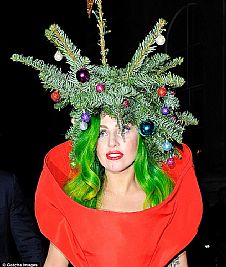 تتابع الفنانة العالمية ليدي غاغا بارتداء الغريب والعجيب في أزيائها وإطلالاتها المبتكرة. فقد أطلّت في حفل Jingle Bell Ball في لندن، وعلى رأسها شجرة الميلاد على شكل قبعة مع شعر أخضر طويل، وقد حضرها الألوف .