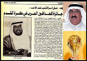 وحدد ' السيد ' الاسبوع الاول من شهر اغسطس من كل عام لاقامة حفل تكريم وتقديم الجائزة العربية شريطة ان تحمل الجوائز اسم الشهيد فهد الاحمد رحمه الله مشيرا ان فكرة ' عدنان السيد ' نفذت بعد 7 اعوام وتحديدا في عام 1999 عندما استلم مهاجم الكويت اللاعب فرج لهيب جائزة اول كرة ذهبية لافضل لاعب عربي واعد .