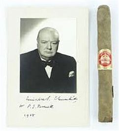يعرض مزاد بريطاني سيجاراً لرئيس الوزراء البريطاني الأسبق، ونستون تشيرتشل، للبيع إلى جانب صورة تحمل توقيعه.