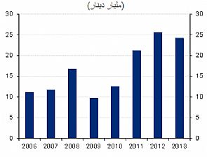• وفيما ارتفعت الصادرات غير النفطية الى أعلى مستوى لها عند 1.9 مليار دينار، إلا أنها لا تزال تمثل 6٪ فقط من إجمالي الصادرات. وقد كان هذا الارتفاع مدفوعاً بارتفاع صادرات منتجات الإثيلين بواقع 16٪ مقارنة بسنة مضت. فقد ازدادت حصة منتجات الإثيلين من الصادرات غير النفطية بشكل كبير خلال السنوات الأخيرة من 12٪ في العام 2008 الى ما يقارب 40٪ بحلول العام 2013. ويرجع هذا الارتفاع بشكل جزئي الى التوسع في انتاج قطاع البتروكيماويات.