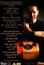 برعاية المركز الثقافي العراقي في بيروت يُحيي الموسيقار الكبير نصير شمة امسية موسيقية في الجامعة الاميركية قاعة الاسامبلي يوم الاثنين الموافق 14/4/2014 بعنوان “ليلة من باب ابل”.