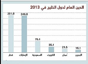 وبلغ الدين العام لدول مجلس التعاون الخليجي بنهاية عام 2013، نحو 646.3 مليار ريال سعودي (172.4 مليار دولار أمريكي)، وجاءت دولة قطر الأكثر استدانة خليجياً بـ 251.8 مليار ريال (67.1 مليار دولار)، تعادل 39 في المائة من إجمالي ديون الدول الخليجية. تلتها دولة الإمارات بديون قدرها 246.8 مليار ريال (65.8 مليار دولار)، بنسبة 38 في المائة من ديون دول مجلس التعاون، لتستحوذ الدولتان على 77 في المائة من ديون الخليج بقيمة 498.6 مليار ريال (133 مليار دولار). وجاءت السعودية ثالثاً بين دول الخليج من حيث قيمة الديون بـ 75.1 مليار ريال (20 مليار دولار)، تعادل 12 في المائة من ديون دول الخليج. ورابعاً جاءت دولة الكويت بديون قدرها 35.1 مليار ريال سعودي (9.3 مليار دولار) بنهاية 2013، تعادل 5 في المائة من ديون دول مجلس التعاون، ثم سلطنة عُمان بديون قيمتها 21.5 مليار ريال سعودي (5.7 مليار دولار)، وأخيراً البحرين بـ 16.1 مليار ريال سعودي (4.3 مليار دولار)، شكّلت مساهمة كل من سلطنة عمان والبحرين 3 في المائة من إجمالي ديون الدول الخليجية.
