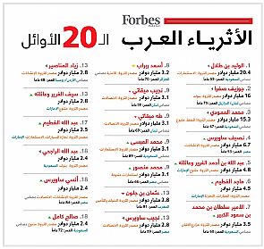 وفيما يلي جدول يبين ترتيب أغنى 20 عربيا خلال عام 2014 وفقا لقائمة فوربس الشرق الاوسط.