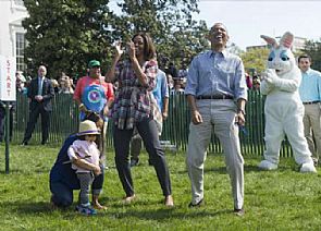 ظهر الرئيس الأمريكي، باراك أوباما، اليوم الإثنين، وإلى جانبه كل من زوجته ميشيل، و'أرنب عيد الفصح'، أمام حشد من الأمريكيين في البيت الأبيض، معلنًا بدء فعاليات الاحتفال بعيد الفصح المسيحي.