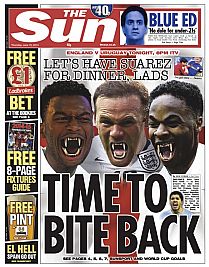 ووضعت الصحيفة صورة لنجوم الأسود الثلاثة، روني ودانييل ستوريدج ورحيم سترلينج على هيئة مصاصي الدماء، وعنونت: 'دعونا نتعشى سواريز اليوم.'