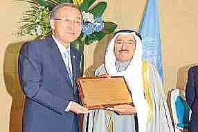 تحت أنظار العالم شرقه وغربه، شماله وجنوبه، أقام الأمين العام للأمم المتحدة بان كي مون احتفالية تكريم لصاحب السمو الأمير الشيخ صباح الأحمد تقديرا لجهود سموه وإسهاماته «قائدا للعمل الإنساني»، وتسليمه نيابة عن الأمم المتحدة شهادة تقدير.وأكد صاحب السمو الأمير الشيخ صباح الأحمد، قائد العمل الإنساني، في كلمة لسموه في الاحتفالية، ان هذا التكريم الذي حظينا به هو تكريم لأهل الكويت وتقدير لمسيرتهم الخيرة في البذل والعطاء والممتدة منذ القدم والتي ستظل مستمرة إن شاء الله.