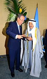 وكان الامين العام للامم المتحدة بان كي مون أقام في مقر الامم المتحدة بمدينة نيويورك يوم امس احتفالية تكريم لسمو أمير البلاد الشيخ صباح الاحمد الجابر الصباح (قائدا للعمل الانساني) تقديرا لجهود سموه واسهاماته الكريمة والانسانية حول العالم.