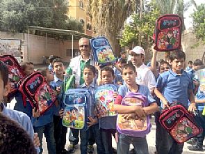 يقوم وفد جمعية الهلال الاحمر الكويتي بتوزيع خمسة آلاف حقيبة مدرسية على طلاب المدارس المحتاجين في قطاع غزة في اطار مشروع دعم انساني بمبادرة من دولة الكويت.