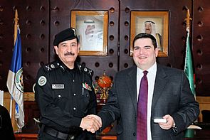 في اطار الجهود التي تبذلها وزارة الداخلية لتحسين الحركة المرورية وتحقيق الامن والأمان لقائدي المركبات وتجنب الحوادث استقبل وكيل وزارة الداخلية المساعد لشئون المرور اللواء/ عبدالله يوسف المهنا قنصل سفارة الجمهورية الفرنسية ايف غابار ، وذلك بحضور مدير إدارة مكتب الوكيل المساعد لشئون المرور العقيد على حسين الصالح .