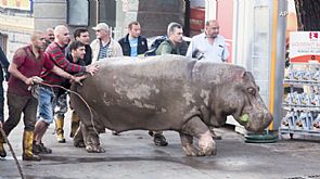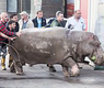 وهذا الخرتيت تجول في وسط المدينة ووجد شجرة لمضغ أوراقها، وبعد لحظات أطلقت فرق الإنقاذ مهدئ الأعصاب عليه في محاولة للإمساك به.