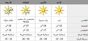 توقعت إدارة الأرصاد الجوية التابعة للإدارة العامة للطيران المدني استمرار برودة الطقس الليلة وغدا، إذ ستبلغ الحرارة الصغرى 2 درجة مئوية، مشيرة إلى أن الرياح ستكون شمالية غربية خفيفة إلى معتدلة السرعة تتراوح سرعتها ما بين 10 إلى 32 كيلو متر في الساعة.