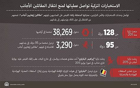 وفي الفترة ذاتها، قامت السلطات التركية، بترحيل ثلاثة آلاف، و290 شخصا بشبهة كونهم 'مقاتلين إرهابييين أجانب' من 95 دولة، ضمنهم أحد منفذي هجمات بروكسل 'إبراهيم البكراوي'.