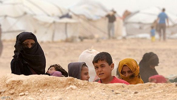 وذكر المعارضون أن عدة طائرات، كانت تحلق على ارتفاع شاهق، قصفت عند الظهر مخيما يقيم به بضع مئات معظمهم من النساء والأطفال من العالقين بمنطقة فاصلة على الجانب السوري من الحدود.