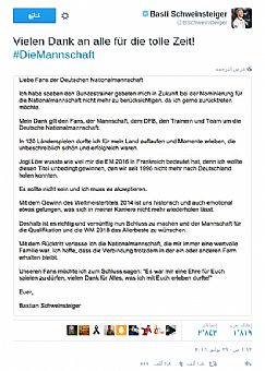 أعلن باستيان شفاينشتايجر قائد المنتخب الألماني لكرة القدم ولاعب وسط مانشستر الإنجليزي اعتزاله اللعب دوليًا صباح اليوم الجمعة.