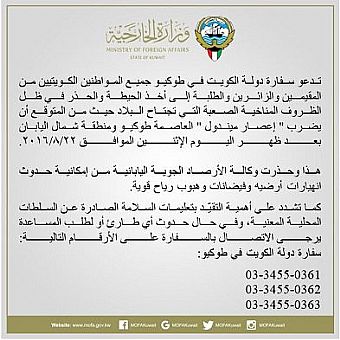 حثت سفارة الكويت في طوكيو المواطنين المتواجدين في اليابان إلى توخي الحيطة والحذر في ظل الظروف المناخية الصعبة التي تمر بها اليابان.