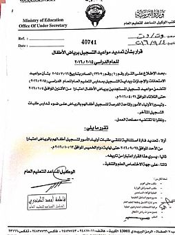 أصدرت وزارة التربية قراراً بتمديد مواعيد التسجيل برياض الأطفال للعام الدراسي 2017/2016 .