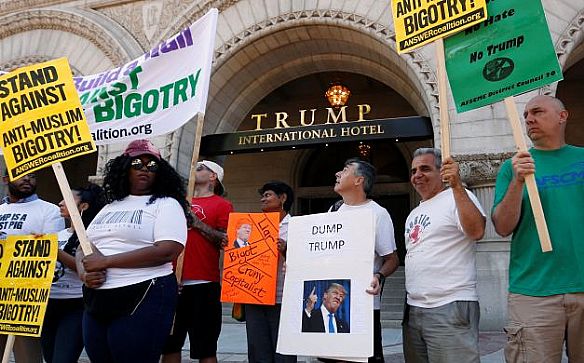 تظاهر عدد من نشطاء حقوق الإنسان ضد افتتاح فندق جديد لدونالد ترامب بالعاصمة الأمريكية واشنطن اليوم الاثنين، في الوقت الذي يواصل فيه المرشح الرئاسي الجمهوري حملته الانتخابية للوصول إلى البيت الأبيض.