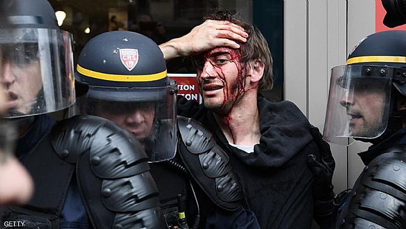 وأوضحت الشرطة أن أحد عناصرها أصيب بحرق في ساقه، كما جرح 5 أشخاص آخرين، من بينهم متظاهر في صدامات في باريس. ورشق متظاهرون مقذوفات على عناصر الشرطة التي ردت بإطلاق قنابل صوتية ومسيلة للدموع.