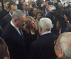 تصافح الرئيس الفلسطيني محمود عباس ورئيس الوزراء الإسرائيلي بنيامين نتنياهو اليوم وتبادلا حديثا قصيراً خلال جنازة الرئيس الإسرائيلي السابق شمعون بيريس.