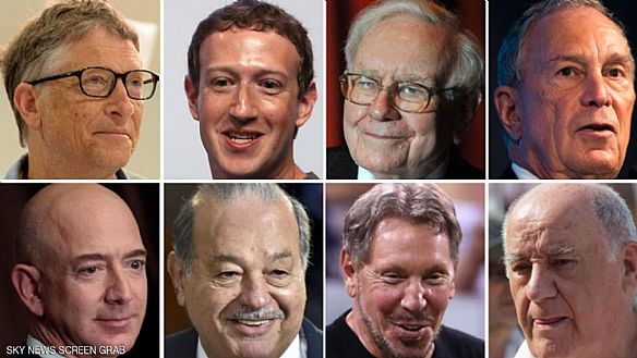 والأشخاص الثمانية التي وردت أسماؤهم في التقرير هم: بيل غيتس أغنى رجل في العالم ومؤسس شركة مايكروسوفت، أمانسيو أورتيغا مؤسس مجموعة إنديتيكس، المستثمر المخضرم وارين بافيت، المكسيكي كارلوس سليم، جيف بيزوس مؤسس شركة أمازون ورئيسها التنفيذي، مارك زوكربيرغ مؤسس موقع فيسبوك للتواصل الاجتماعي، لاري اليسون مؤسس شركة أوراكل، ورئيس بلدية نيويورك السابق مايكل بلومبرغ.