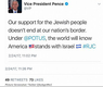 فقد غرد بنس على حسابه بتويتر قائلا:' ترامب وأنا نقف مع إسرائيل لإن قضيتها قضيتنا وقيمها هي قيمنا، ومعركتها هي معركتنا'.