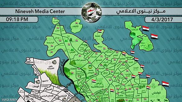 نشر مركز نينوى الإعلامي، الأحد، خريطة حديثة توضح المناطق التي استعادتها القوات العراقية والميليشيات الداعمة لها من داعش في مدينة الموصل، والجزء المتبقي تحت سيطرة التنظيم الإرهابي.