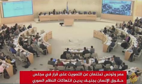 امتنعت مصر وتونس عن التصويت خلال جلسة لمجلس حقوق الإنسان التابع للأمم المتحدة في جنيف أمس الجمعة على مشروع قرار يدين استمرار الانتهاكات المنهجية في سوريا.
