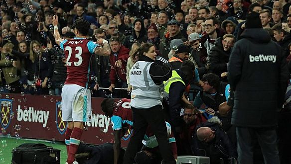 تعرَّض أحد مشجعي نادي وست هام يونايتد، للإصابة بعد سقوط إحدى اللوحات الإعلانية عليه في أثناء الاحتفال بهدف انتصار فريقه على توتنهام في افتتاح الجولة 36 من الدوري الإنجليزي.