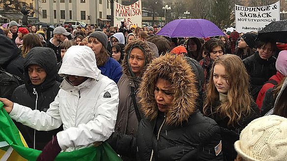 ورفع متظاهرون تجمعوا في ميدان مدبورغاربلاستن بالعاصمة ستوكهولم، لافتات كتب عليها 'لا أحد غير قانوني'، و'الطلاب إلى جانب الشباب اللاجئين'، و'أوقفوا ترحيل الشباب'.
