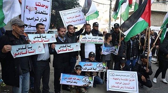 وجرت التظاهرة بدعوة من القوى الوطنية والإسلامية، ورفع المشاركون فيها لافتات مكتوبة منددة بالإعلان الأمريكي بشأن القدس وممارسات 'التهويد' الإسرائيلية في المدينة.