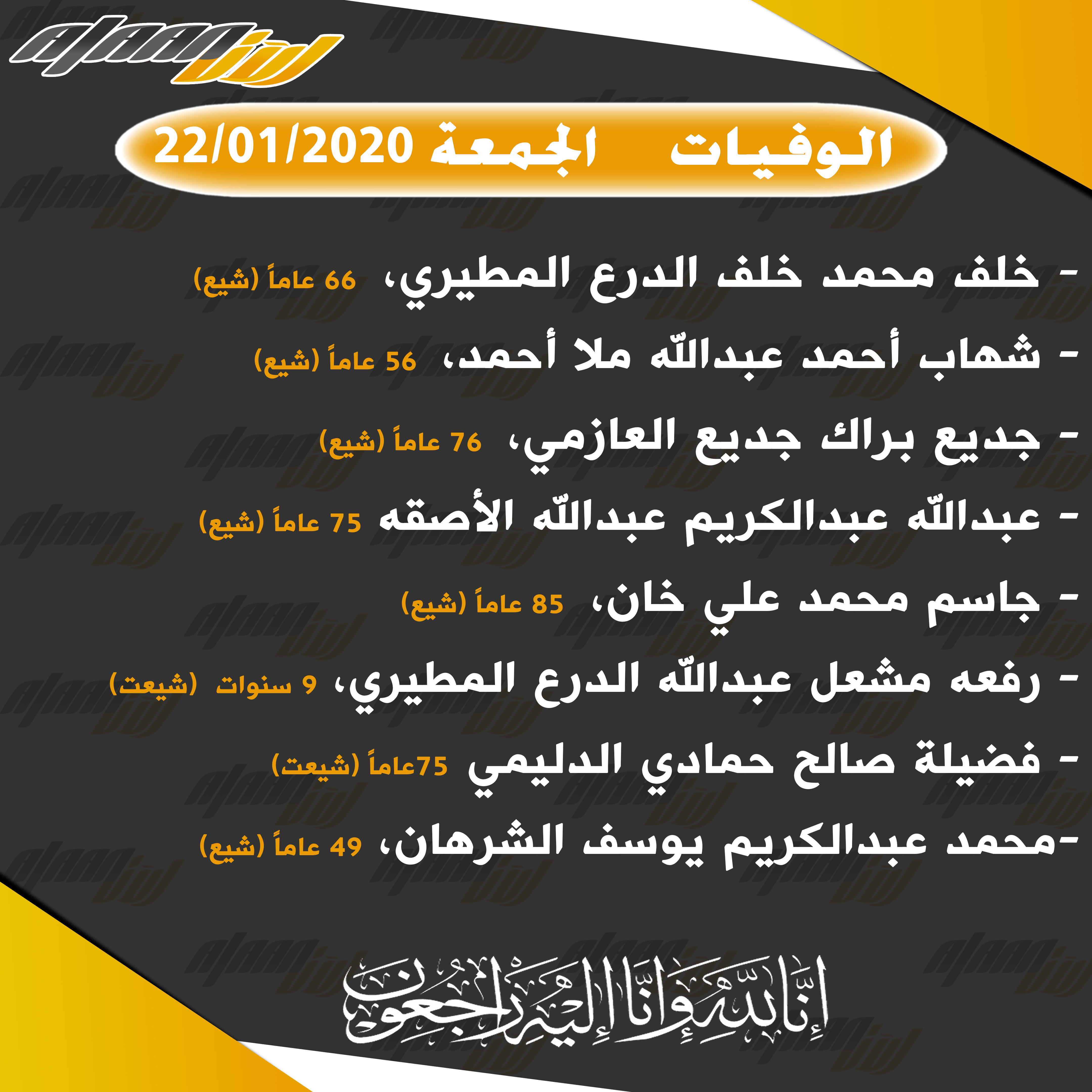 وفيات الجمعة 22 يناير 2021 | #وفيات_الكويت وفيات الآن يناير 22, 2021, 8:50 م 1044 مشاهدات 0 وفيات الجمعة 22 يناير 2021 | #وفيات_الكويت