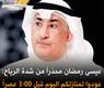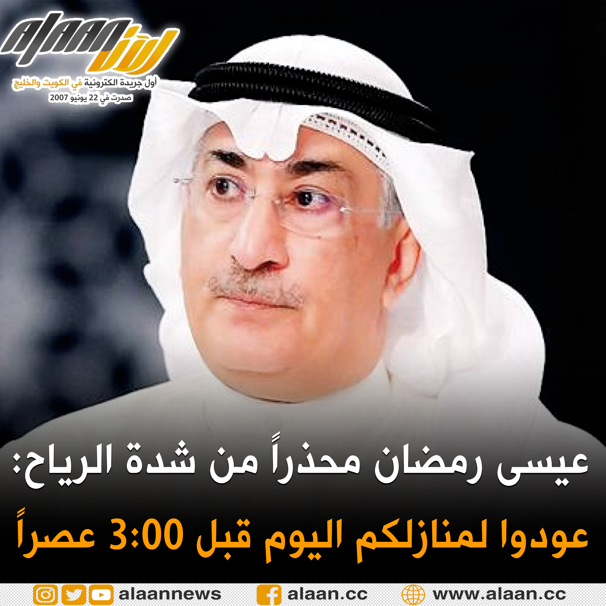 #عاجل- عيسى رمضان: عودوا لمنازلكم قبل الساعة الثالثة عصراً الأجواء غير مستقرة خصوصاً لمرضى الربو والحساسية، رياح تصل سرعتها لـ60 الى 70 كم مصحوبه بالغبار "اغلقوا «الشترات والدرايش» مع وضع فوطه فيها ماي على اماكن تسرب الهواء"
