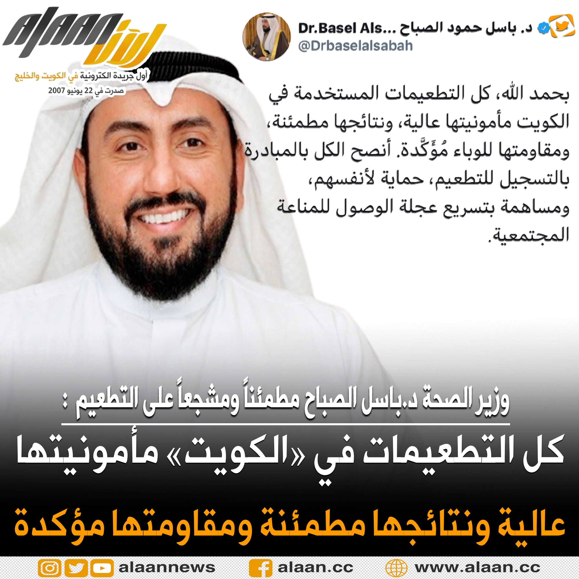 غرد #وزير_الصحة الشيخ د.باسل الصباح مطمئناً ومشجعاً للشعب الكويتي و لكافة المقيمين على أرض الكويت بسلامة التطعيمات و نتائجها و آثارها المترتبة على تلقي اللقاح وتضمن نص التغريدة :