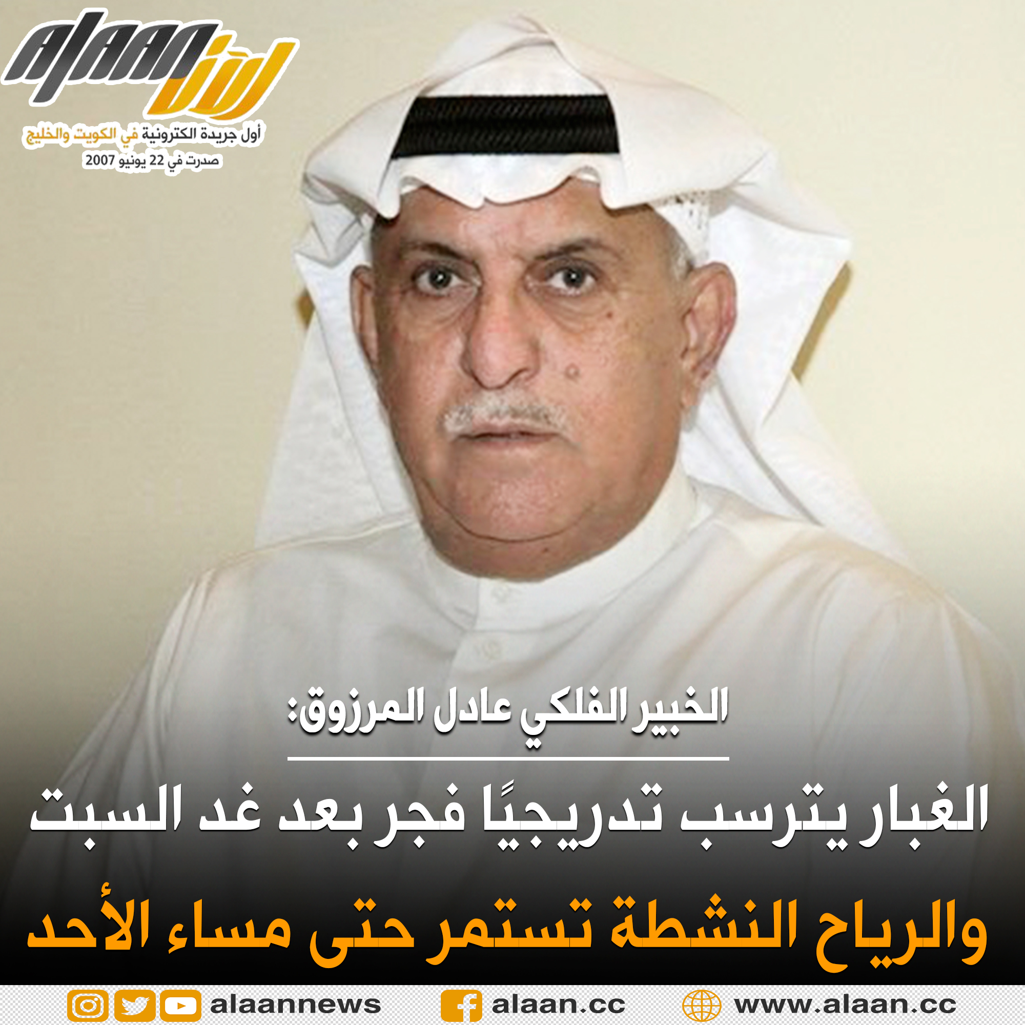 وزاد المرزوق: لكن من بعد الساعة العاشرة مساء من هذه الليلة ستخف حدة الرياح الشمالية الغربية حيث من المتوقع أن يترسب الغبار تدريجيا في ساعات الفجر الأولى من يوم غد السبت، ولكن ستستمر الرياح النشطة حتى مساء الأحد المقبل، حيث تخف حدة الرياح، وستستمر الرياح هادئة حتى ظهر الثلاثاء 16 الجاري، ثم تعود الرياح إلى النشاط مرة أخرى ولكن بنسبة أقل وتكون سرعتها في هذه الأيام المقبلة من (25-35) كم/س ثم تهدأ الرياح الشمالية الغربية، ولكن تعاود نشاطها مرة أخرى أيضا يوم السبت 20 الجاري، (والله تعالى أعلم).