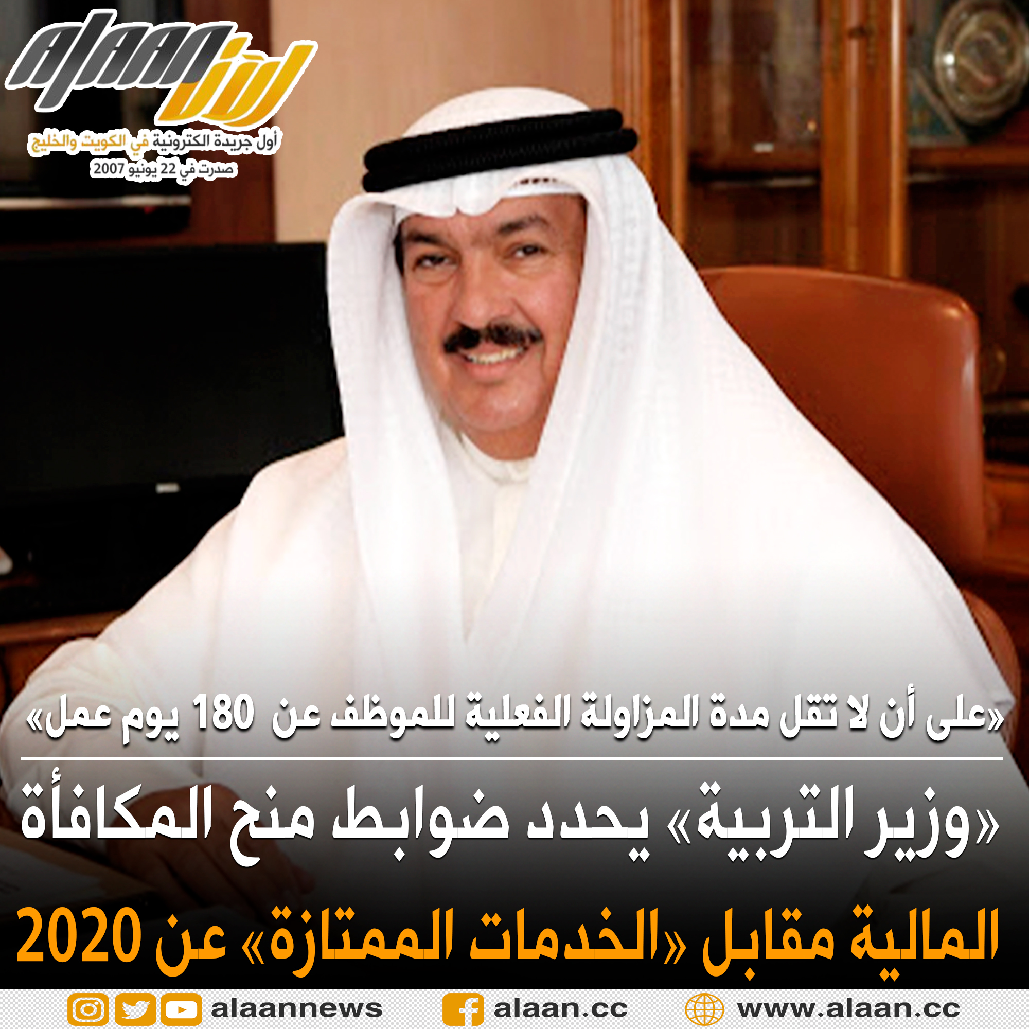 أصدر وزير التربية الدكتور علي المضف قرارا بشأن ضوابط منح المكافأة المالية مقابل الخدمات الممتازة للعاملين في ديوان عام الوزارة والإدارات المركزية والإدارات العامة للمناطق التعليمية للعام الميلادي 2020.